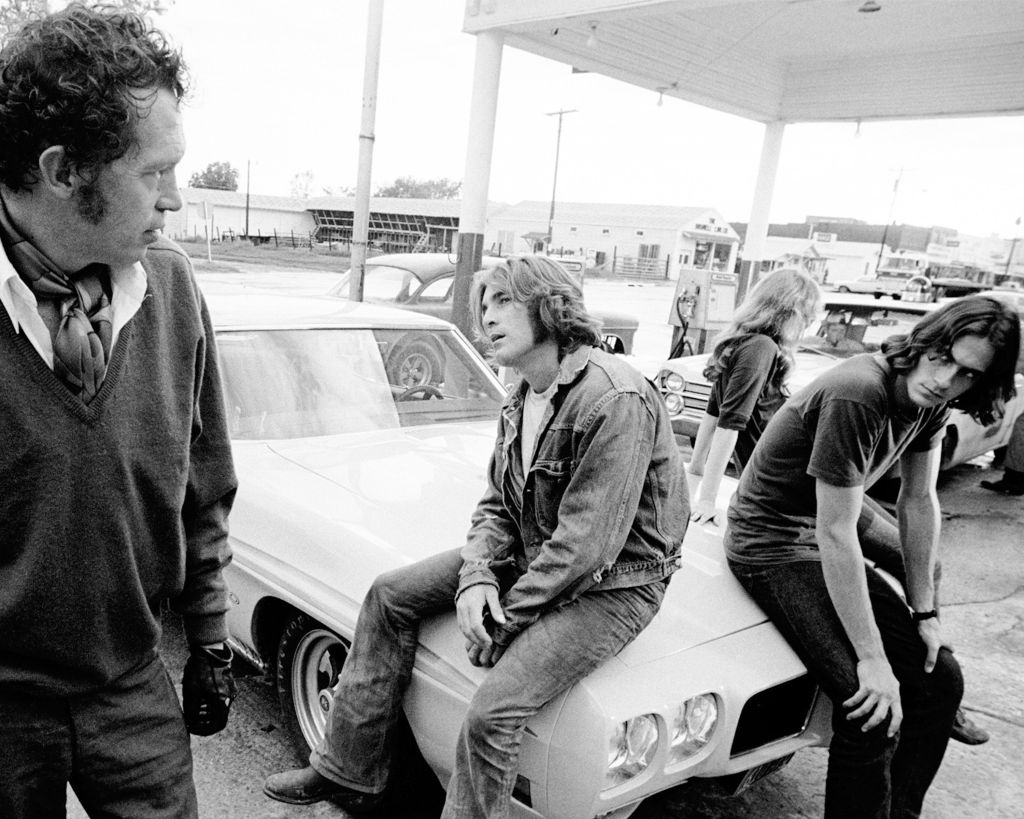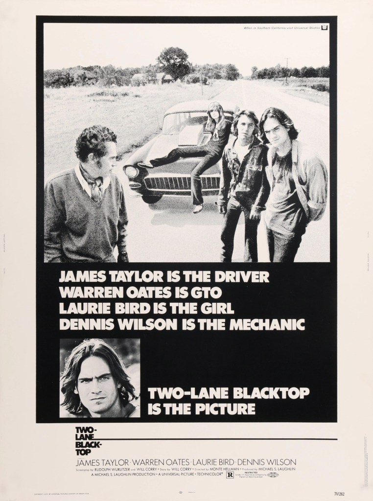 “Two-Lane Blacktop,” a 1971 road movie directed by Monte Hellman and written by Rudy Wurlitzer. The film follows two drag racers, referred to only as The Driver and The Mechanic (played by musicians James Taylor and Dennis Wilson), traveling across the country in a souped-up 1955 Chevy racing car, looking for competition and avoiding any kind of attachments or responsibilities.