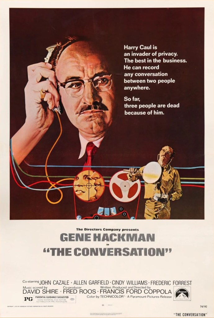 “The Conversation” is a psychological thriller released in 1974 and directed by Francis Ford Coppola. The movie stars Gene Hackman as Harry Cau, a surveillance expert hired to record a conversation between a couple, Ann and Mark, played by Cindy Williams and Frederic Forrest. The conversation takes place in a public place, and Harry and his team (John Cazale as Stanley) are hired by a mysterious client who wants to know the content of the conversation.