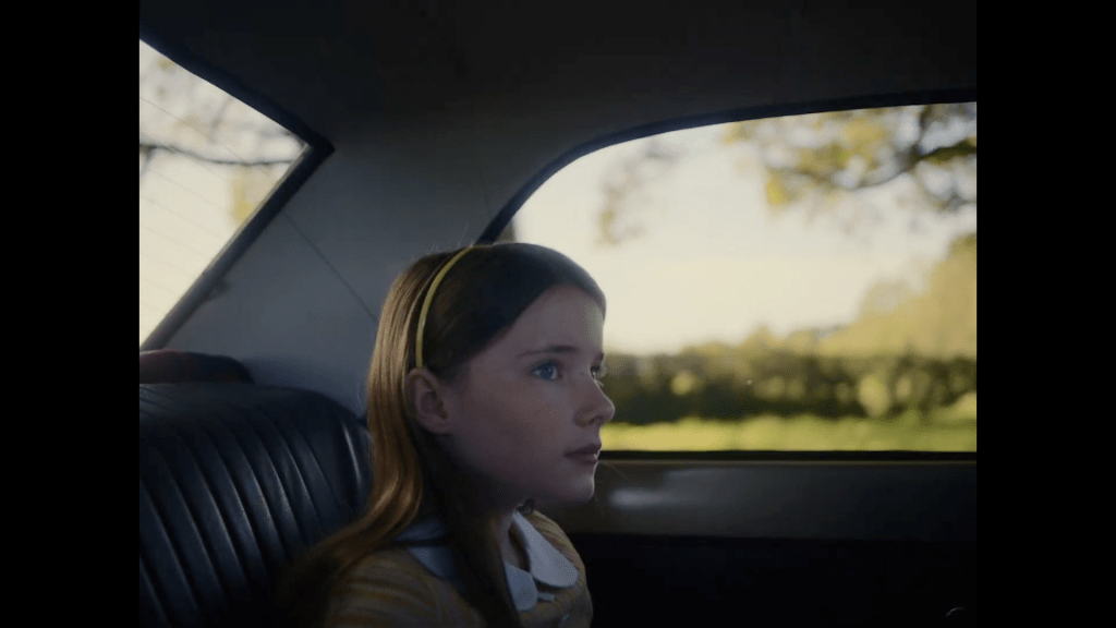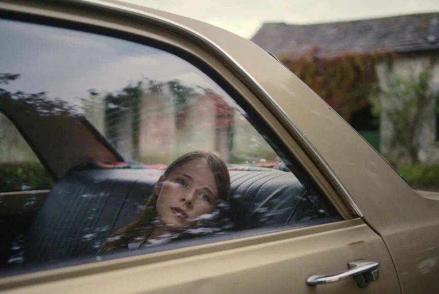 Upon arrival, her mother barely acknowledges her, and her father immediately chastises Cáit for sneezing; this causes a tense atmosphere between the Cinnsealachs, who have both clearly become very protective of Cáit. Eibhlín and Seán express to Cáit’s parents that she can stay with them anytime. At this point, both reluctantly say their goodbyes. As the Cinnsealachs drive down the driveway and around a corner, Cáit suddenly runs from her garden and sprints toward the car, catching up to the couple as Seán closes the gate. She leaps, embracing Seán while Eibhlín sobs quietly in the car. Cáit looks back and sees her father angrily making his way toward them. In one of the most emotionally gripping moments in the film, and says quietly “Daddy” to alert Seán to his presence. After a brief pause, she says “Daddy” again.