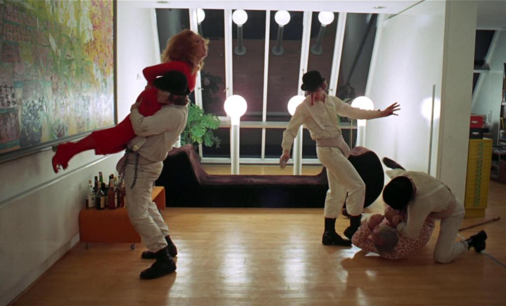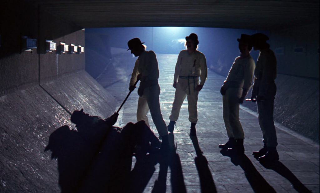 The story occurs in a futuristic British city where rampant societal decay and youth rebellion are rampant. Alex DeLarge (portrayed by Malcolm McDowell) is the leader of a gang of delinquents who engage in a series of heinous acts, including violence, rape, and destruction. Alex and his “droogs” (gang members) revel in their lawless behavior, enjoying the chaos they create.