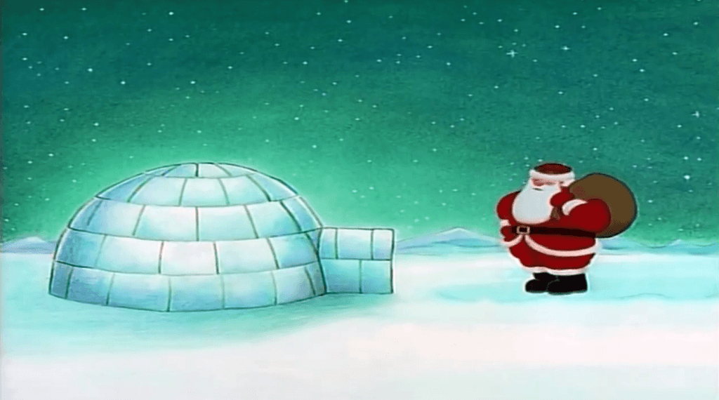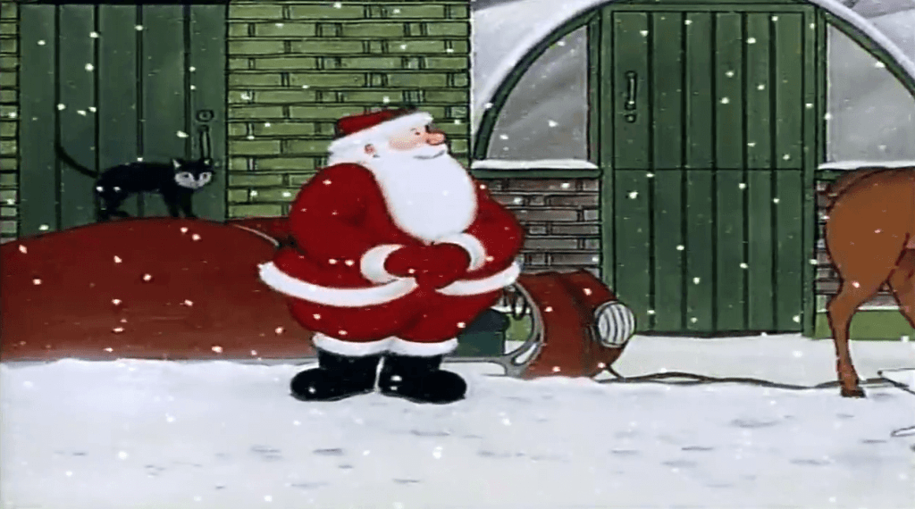 Now back at home, the preparations soon begin for the pending holiday, with him single, handily dealing with thousands and thousands of letters addressed to Father Christmas. As he takes off on Christmas night, we break into a musical number, “Another Blooming Christmas,” as a montage shows him delivering presents to children all over the place and the challenges he faces getting into different styles of houses.