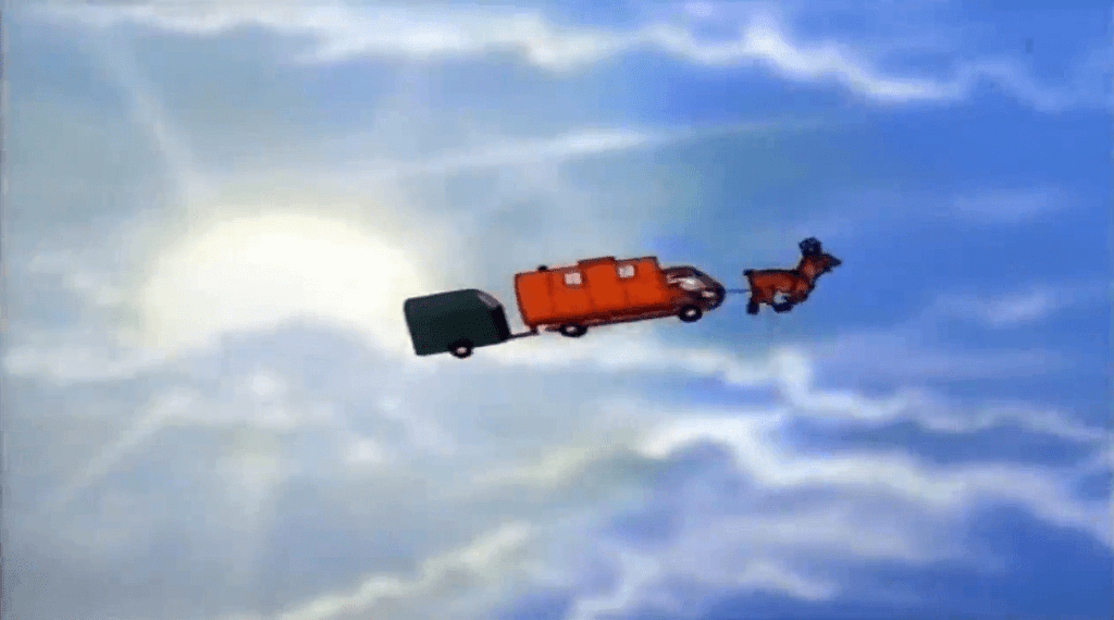 After complaining about how expensive the meal was, we see him returning to his caravan, where he suddenly has a bout of funny tummy from overeating. This leads us to a somewhat psychedelic nightmare dream sequence that suddenly wakes Father Christmas, leading him to run to a nearby bush, not once but twice.
