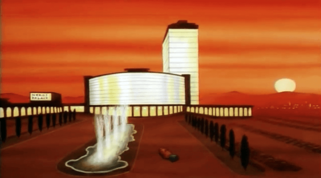 Las Vegas has sun and an abundance of oversized meals, including his allusive fries and ketchup. We follow his adventures from floating around in a pool with fancy cocktails, playing roulette in the casino, attending shows, playing golf, and generally becoming increasingly tanned as time passes. By the time he is first recognized by the pool, we have established that he has spent six weeks in Las Vegas.