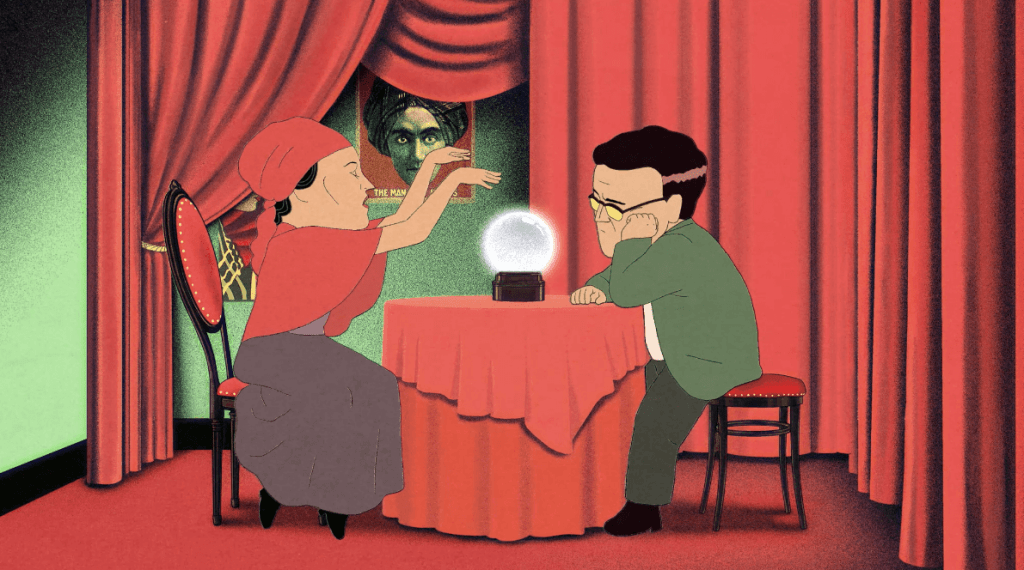 The film then shows scenes depicting his skepticism of the world, including encounters with a fortune teller, the Illuminati, and his distrust of religion.