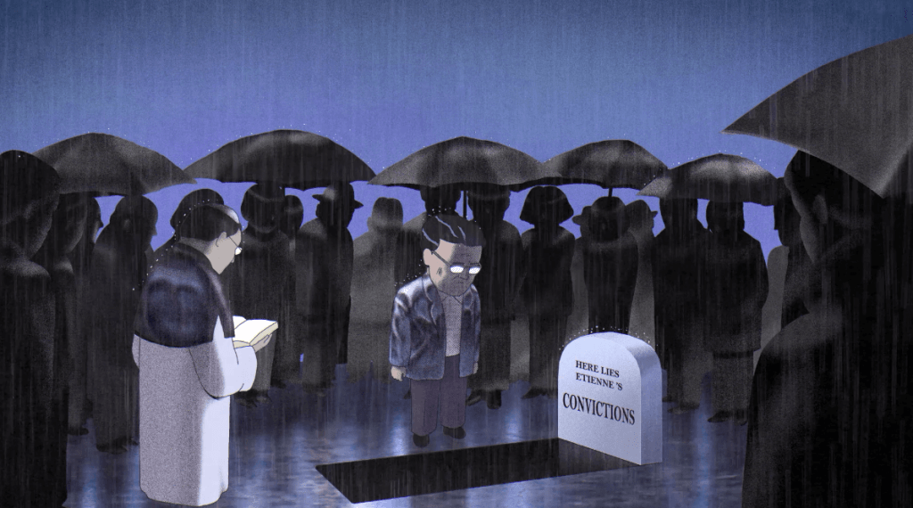 Etienne was a brilliant scientist who gained fame and wealth by writing a book about skepticism. His book made him famous amongst women, but the only person he had a genuine connection with was Magali, whom he had met at university. One day, while they were having a picnic, Magali was defending a subject when Etienne said something that would change everything. The sentence caused Magali to get up abruptly and leave Etienne at the lake’s shore. While sitting alone, he suddenly noticed something and saw a UFO hovering above him. Later, when he got home, he found an envelope under his door that read, “You are invited to the burial of your own convictions.”