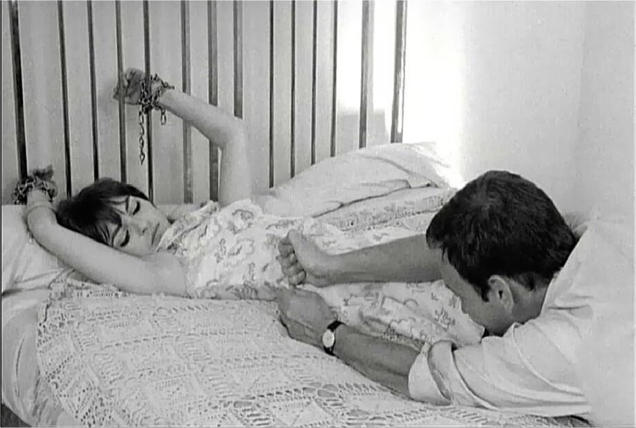 Told that his next assignment will be to take a shipment back to Paris, he looks up Eva for another session and discovers that she has betrayed him by informing the police. Initiating a bondage fantasy, he strangles her and immediately goes into hiding. Slipping out to buy a newspaper, he sees a report of the murder above an advertisement for a strip club where the star performer in a bondage fantasy resembles Eva. On arriving there, he is surrounded by police, but before they can arrest him, he is shot dead by his contact.