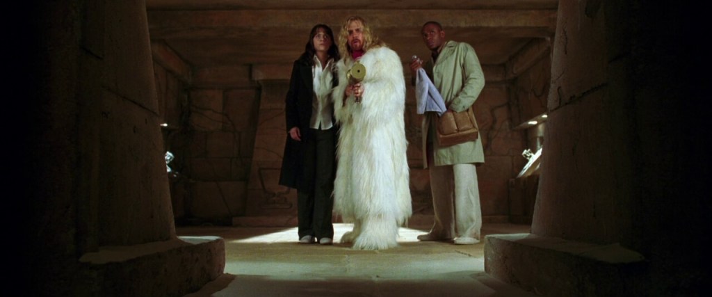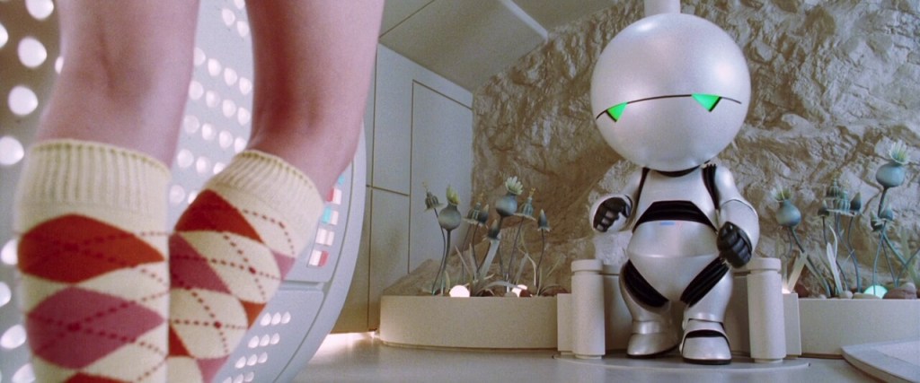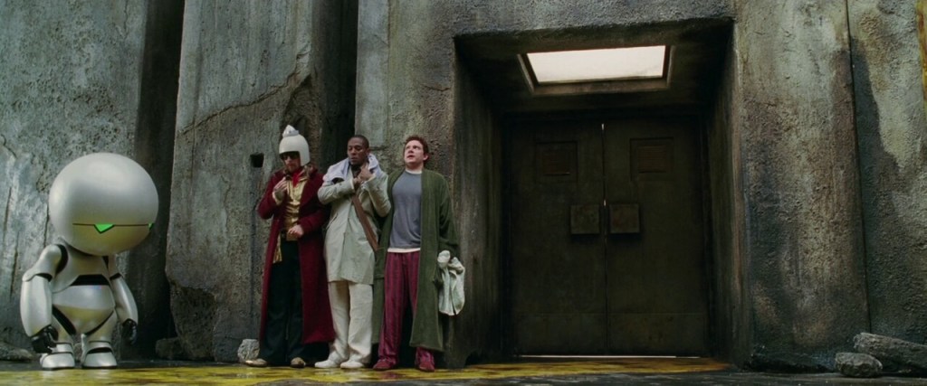 Ford, a researcher for the titular Hitchhiker’s Guide to the Galaxy, takes Arthur onto the Vogon spaceship just before Earth’s demolition. From there, the two embark on a spacefaring journey that introduces them to a series of eccentric characters, including Zaphod Beeblebrox (Sam Rockwell), the two-headed, eccentric President of the Galaxy; Trillian (Zooey Deschanel), the only other human survivor of Earth’s destruction; and Marvin the Paranoid Android (voiced by Alan Rickman), a chronically depressed robot.
