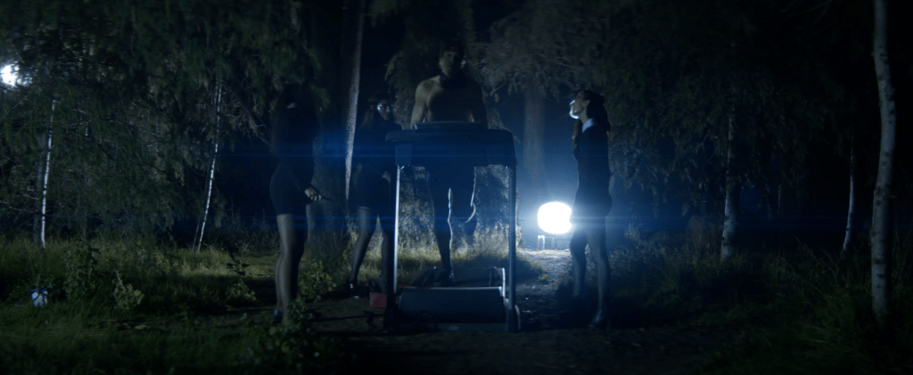 We then cut to a scene in the forest where Jason is being seduced on a treadmill by three Russian women (played by Natasha Blasick, Alisa Levinson, and Gabrielle Salinger), clearly alluding to something sexual that is about to happen. Jason plays along even though he finds the whole process frustrating. He asks if he can see the women who have disrobed him and are about to seduce him; they agree only once and are all masked in “Debbie” masks, a rather eerie detail, but also revealing a rather sinister, unkept man (played by Kalus Harrison) who suddenly instructs him to run while simultaneously starting the treadmill. Jason is then forced to run while being steadily whipped by the three women. He calls out for Debbie in vein. During this scene, we see Debbie sitting quietly in the back of the limo, seemingly observing this torture from afar. We can’t help but notice that she is contemplating her decision to psychically and emotionally torment Jason in what can only be described as an act of revenge, or at the very least, the most horrendous breakup of all time.