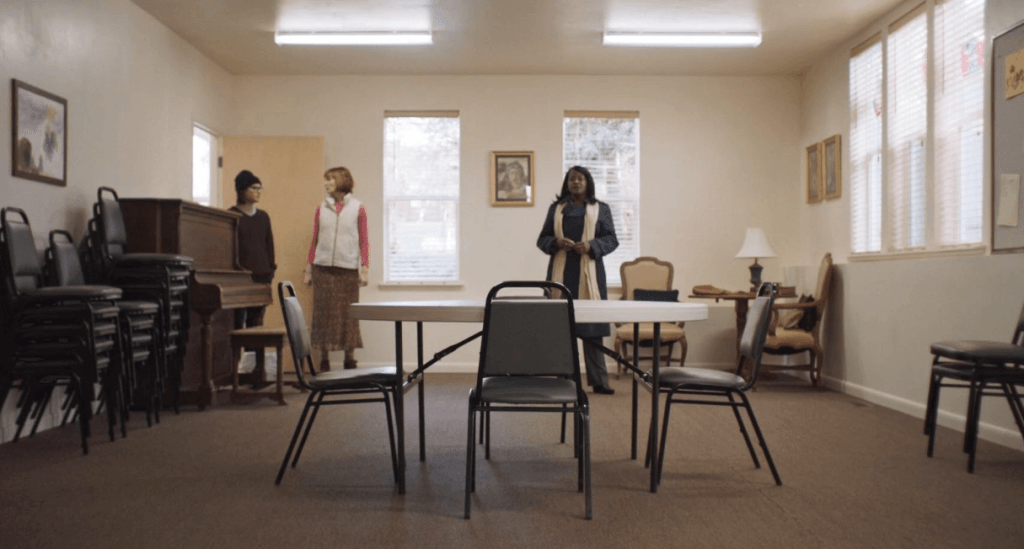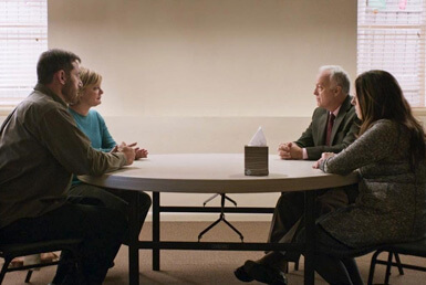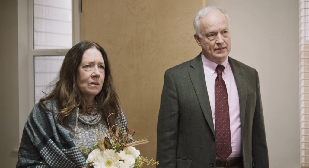 Set in a nondescript church basement, the film centers on a meeting between two sets of parents: Jay and Gail (played by Jason Isaacs and Martha Plimpton), whose son was killed in a school shooting, and Richard and Linda (played by Reed Birney and Ann Dowd), the parents of the shooter.