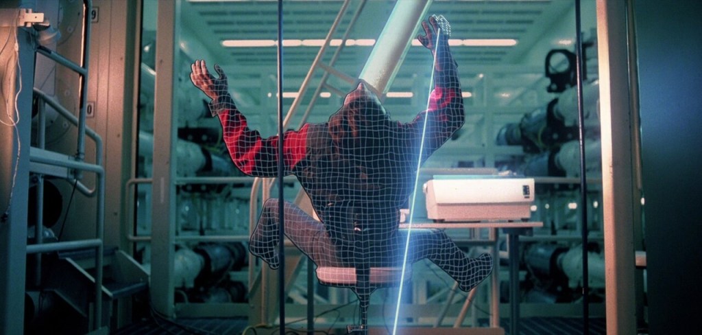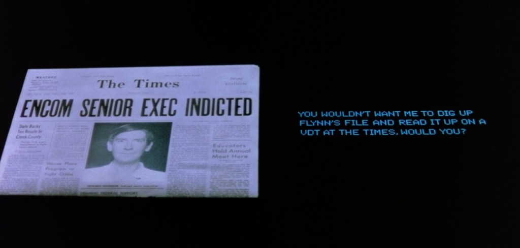 Flynn persuades Alan and Lora to help him break into the ENCOM mainframe to find the needed evidence. As Flynn hacks into the system, the MCP, an artificial intelligence developed by Dr. Walter Gibbs (Barnard Hughes) but now controlled by Dillinger, detects his presence and uses Lora’s experimental digitization laser to transport Flynn into the digital world.