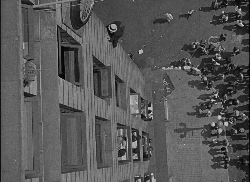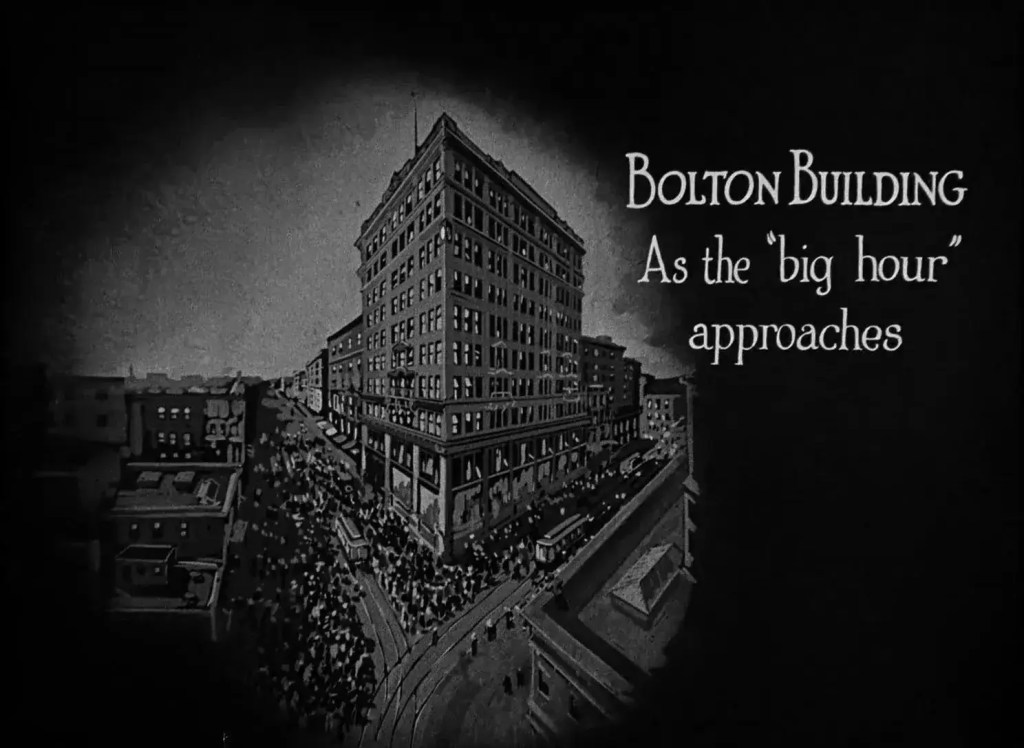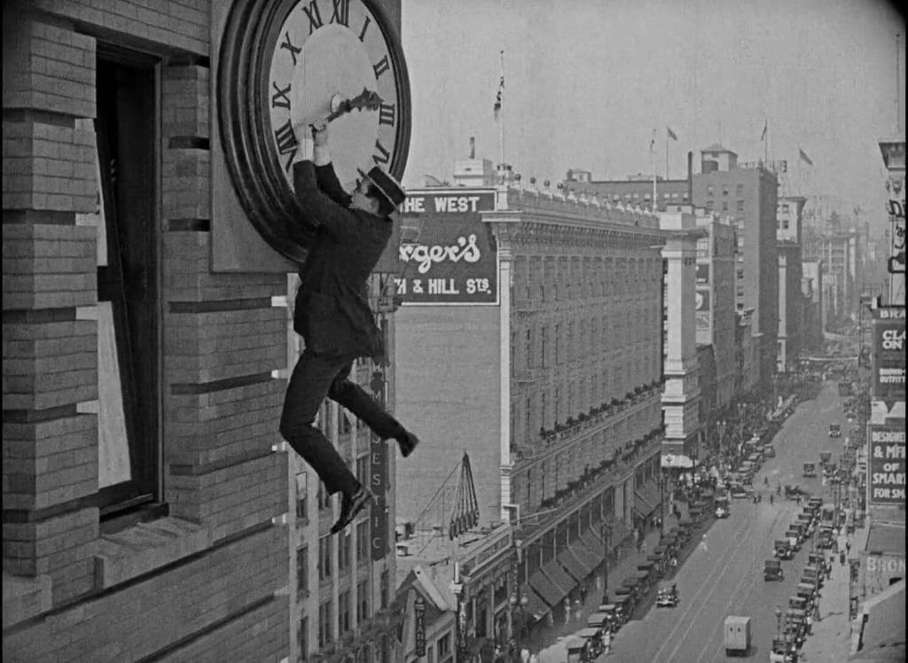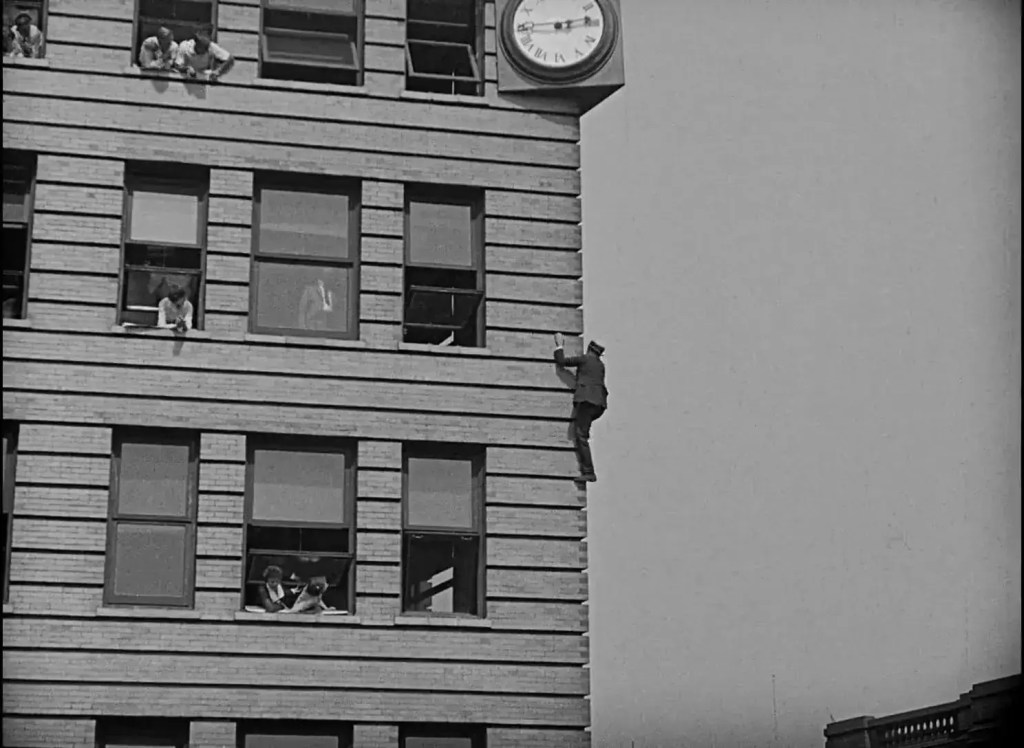The tension peaks when Harold reaches the building’s clock, the film’s most iconic image. As he hangs from the clock’s hands, the crowd below watches in horror, while Mildred, who has arrived in the city to surprise Harold, sees him in his perilous position and fears for his life. Harold’s struggle to climb the building is thrilling and comedic, blending physical comedy with real danger.