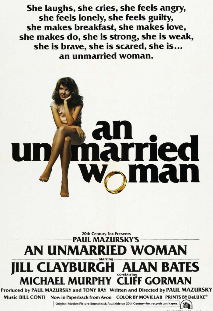 “An Unmarried Woman” is a 1978 American drama film directed by Paul Mazursky. It is an emotionally resonant exploration of love, loss, and personal growth centered around a woman’s journey of self-discovery after her marriage unexpectedly falls apart. The film stars Jill Clayburgh in a career-defining role and is supported by Alan Bates and Michael Murphy.