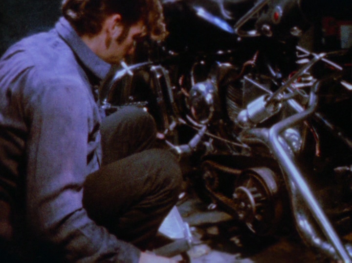The film opens with scenes of a young biker named Scorpio (played by Bruce Byron) preparing his motorcycle. These sequences are intercut with close-ups of Scorpio’s meticulous work on the bike, emphasizing his care and pride in his machine. The attention to detail in these early scenes sets the tone for the film’s exploration of the biker subculture.