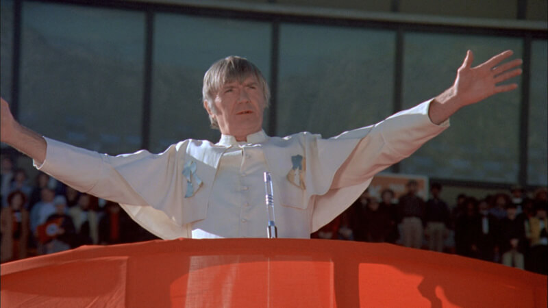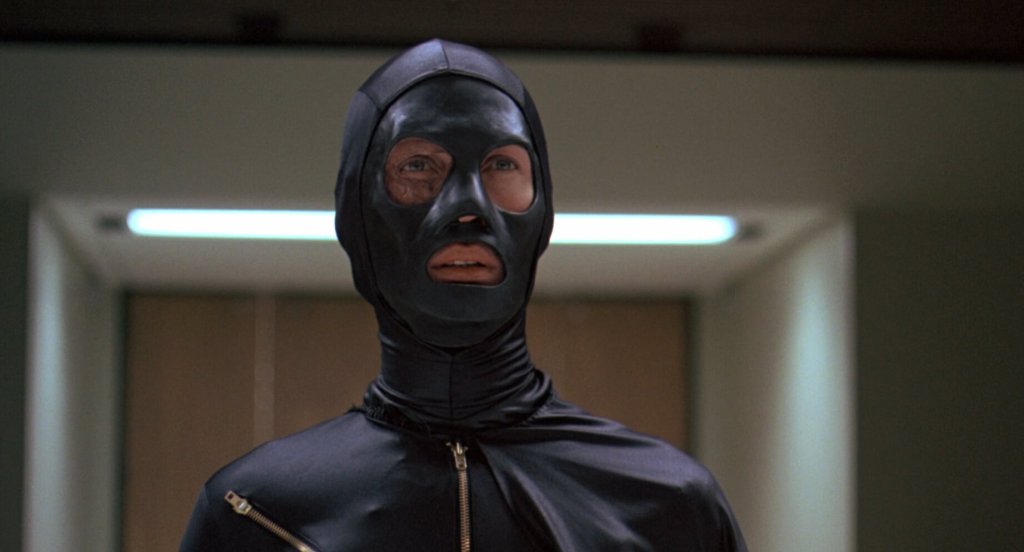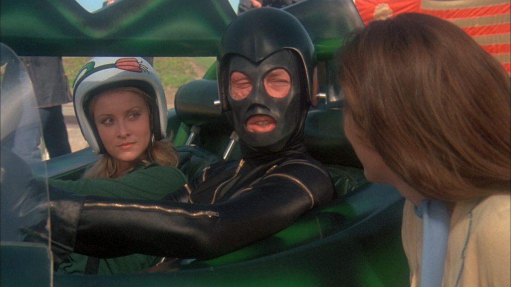 Set in the dystopian year 2000, the United States has become a totalitarian regime where the government uses brutal entertainment to distract and pacify the population. The most popular form of entertainment is the Transcontinental Death Race, a cross-country race where participants drive weaponized, custom-built cars and earn points by running over pedestrians. The bloodier the death, the higher the score. This violent spectacle is broadcast nationwide and hailed as a patriotic event, reinforcing the authoritarian state’s control over the masses. The film’s pivotal characters is Frankenstein (played by David Carradine): The film’s protagonist, Frankenstein, is the reigning champion of the Death Race and a national hero. Known for his mysterious appearance—complete with black leather, a cape, and a mask—Frankenstein is believed to have been severely disfigured in previous races, which adds to his mythic status. However, it’s revealed that he is not the same man each time but rather a series of drivers who adopt the Frankenstein persona, adding to the mystique.