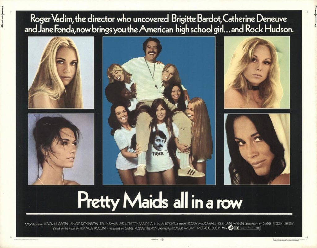 Pretty Maids All in a Row (1971) is a dark comedy-thriller directed by Roger Vadim, and starring Rock Hudson in a surprisingly sinister role. The movie is an unusual blend of crime drama, sexual farce, and satire set in a high school environment. Adapted from a novel by Francis Pollini and written for the screen by Gene Roddenberry (creator of Star Trek), the film deals with themes of sexual liberation, authority, and morality in a quirky, often controversial manner.