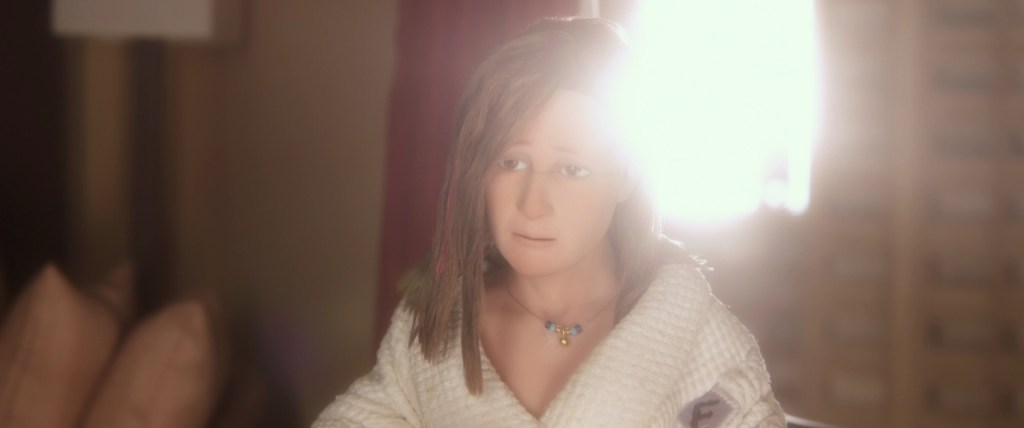 At his hotel, the sterile and impersonal Al Fregoli, Michael experiences a brief respite from his existential despair when he hears a unique voice for the first time in years — that of Lisa Hesselman (voiced by Jennifer Jason Leigh). Lisa is staying in the same hotel to attend Michael’s talk, and unlike everyone else, she appears different to him: she has her own face and voice. Lisa, a shy and self-deprecating woman with low self-esteem, stands out as a beacon of individuality, and Michael is immediately captivated by her.