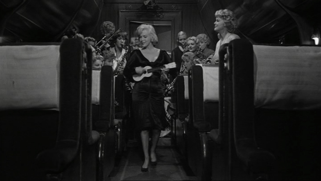 Aboard the train to Miami, Joe and Jerry quickly meet the band’s charismatic singer and ukulele player, Sugar Kane Kowalczyk (Marilyn Monroe). Sugar is beautiful, fun-loving, and has a soft spot for saxophone players, though her string of unsuccessful romances has made her wary of love. Joe, as “Josephine,” is immediately attracted to Sugar, and he soon concocts a plan to win her over. Once they arrive in Miami, he adopts yet another identity—this time as “Junior,” a millionaire oil heir—hoping to woo her without blowing his cover.