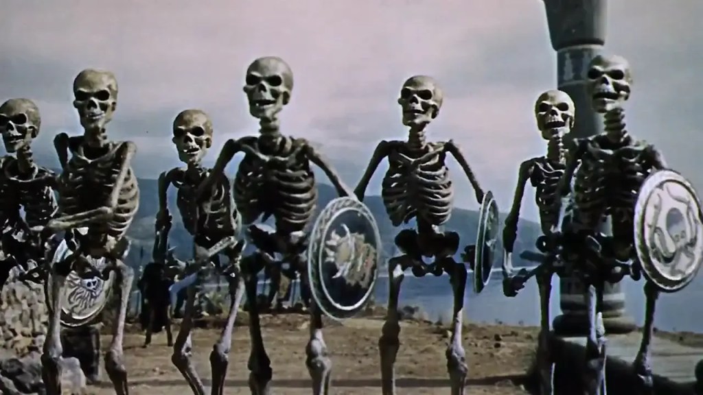 As Jason and the Argonauts attempt to escape, Aeëtes summons the most terrifying challenge yet—he sows the teeth of the hydra into the earth, causing a group of skeleton warriors to rise from the ground. In one of the most iconic sequences in cinematic history, Jason and his men engage in a desperate sword fight against the Children of the Hydra’s Teeth. The relentless skeletons, animated through Ray Harryhausen’s masterful stop-motion effects, prove nearly invincible. Many of Jason’s men fall in battle, but he and Medea escape to the Argo.
