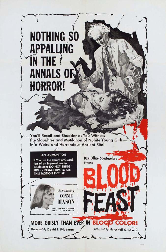 Blood Feast is widely regarded as the first true “gore film.” Its low-budget, grindhouse aesthetic and campy performances add to its cult appeal, while its over-the-top violence paved the way for later horror classics such as The Texas Chain Saw Massacre (1974) and Friday the 13th (1980).