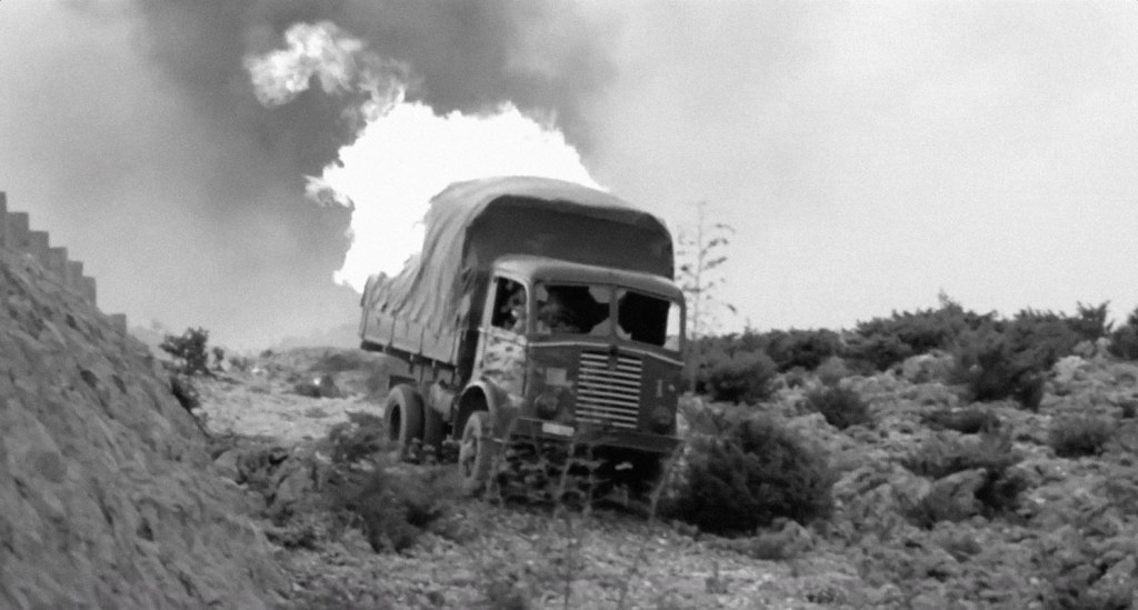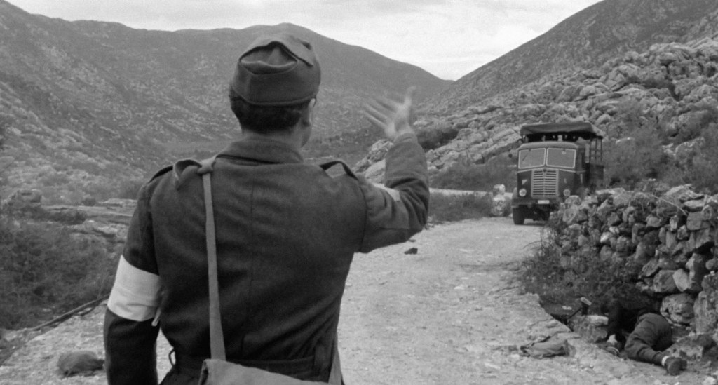 Shortly after, their own lorry is ambushed and goes off the road in flames. The survivors carry the wounded to an abandoned cottage, where the still-hysterical Alessi says he will go and get help. Realizing he wants to escape, the wounded Castagnoli stops him at gunpoint. Meanwhile, Elenitza is succumbing to her wounds, and in front of everybody, Alessi shoots her dead. After dark, carrying Castagnoli, what is left of the group staggers over the mountains and arrives at a village emptied and burned by Blackshirts, who Alessi joins up with. They have captured some alleged partisans, who they shoot.