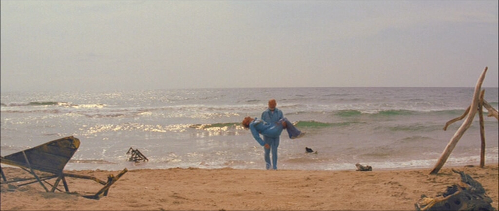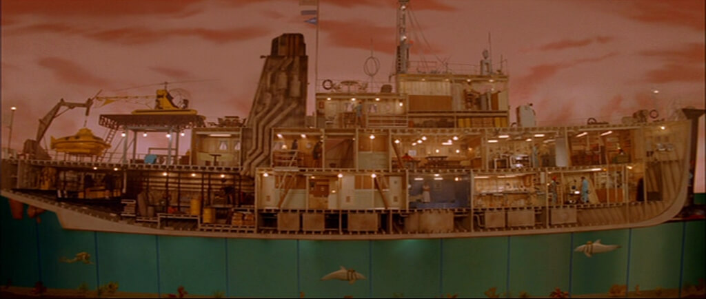 Visually, the film is a feast of meticulously crafted sets, both on the water and on the ship, as well as in the dreamlike sequences that blur the line between fantasy and reality. Anderson’s signature whimsical and highly stylized approach is evident in every detail, from the quirky costumes to the pastel-colored, retro-futuristic look of the ocean liner, the Belafonte, to the way the characters speak and interact in a world that seems to exist in its own peculiar bubble.