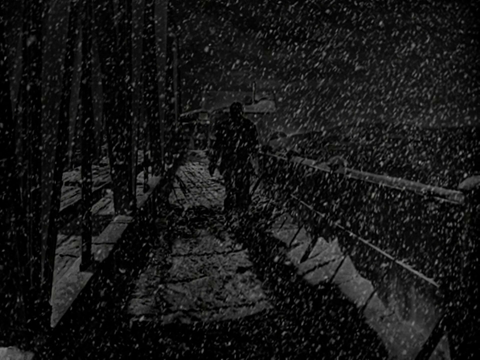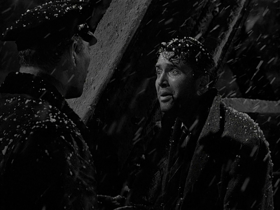 Overcome with hopelessness, George stands on a bridge, preparing to jump into the freezing river. Just then, Clarence appears and cleverly jumps into the water himself, forcing George to save him instead. As they dry off, Clarence reveals he is George’s guardian angel.