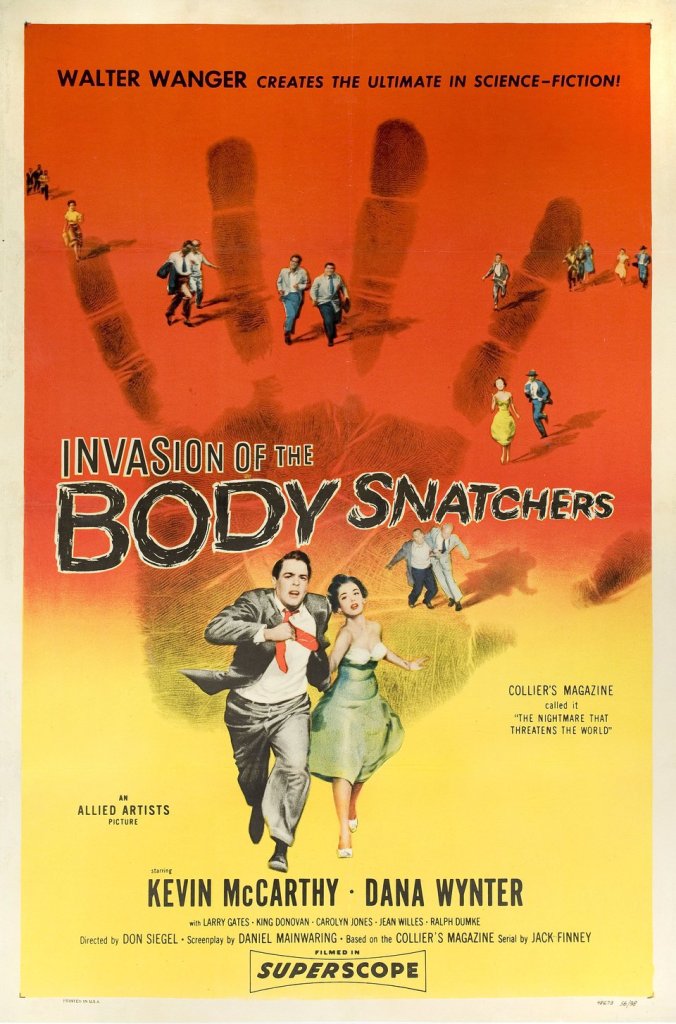 ‘Invasion of the Bodysnatchers’ is a 1956 Science fiction horror film directed by Don Siegel Set in the small town of Santa Mira, California, the film follows Dr. Miles Bennell (Kevin McCarthy), a respected local physician, who returns from a medical conference to find that something is disturbingly wrong in his hometown. Several patients come to him with an identical complaint: they believe that their friends and relatives have been replaced by imposters—emotionless duplicates who look exactly like the real people but somehow aren’t them. The film stars Dayna Wynter, Kevin McCarthy, King Donovan, Larry Gates, Carolyn Jones, Virgina Christine, Richard Deacon, and Jean Willes.
