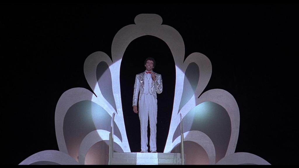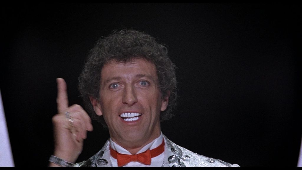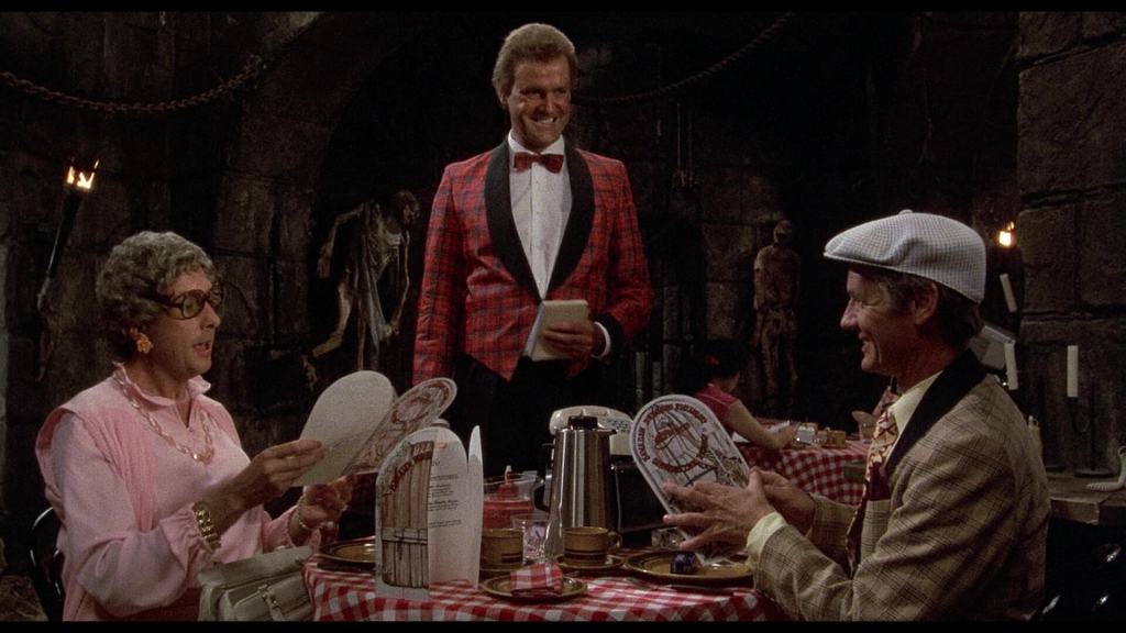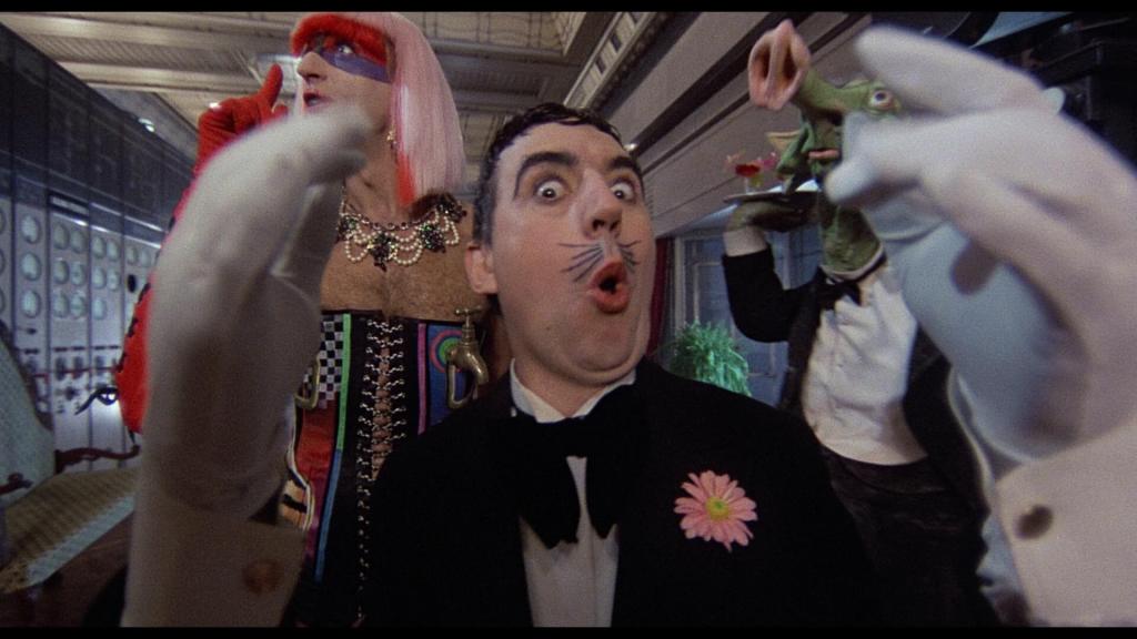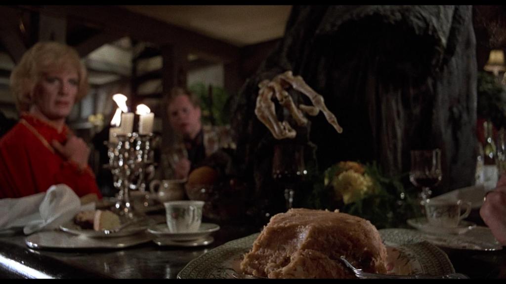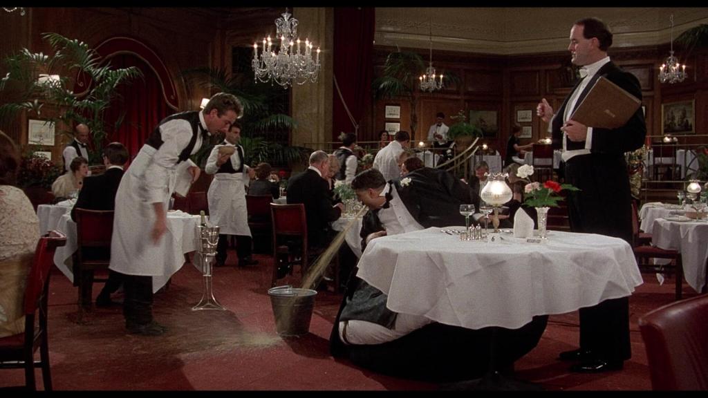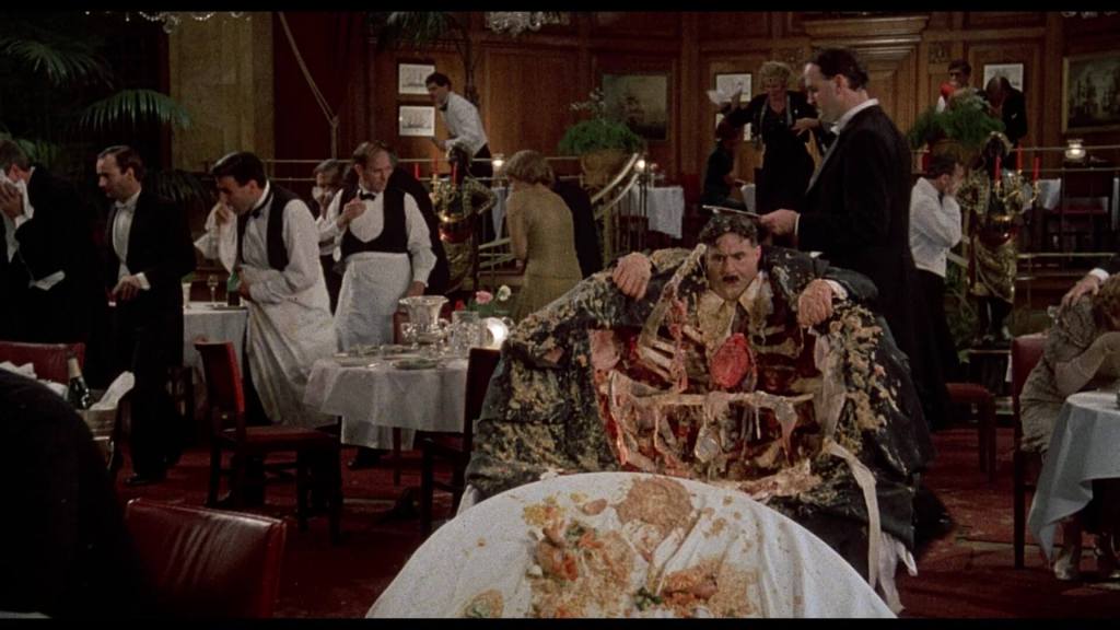 One of the film’s most infamous scenes: Mr. Creosote, a grotesquely obese man (played by Terry Jones), visits a fancy restaurant and proceeds to gorge himself to the point of explosion—literally—after consuming a “wafer-thin mint.”