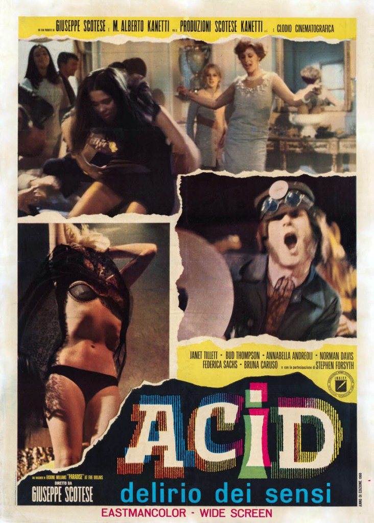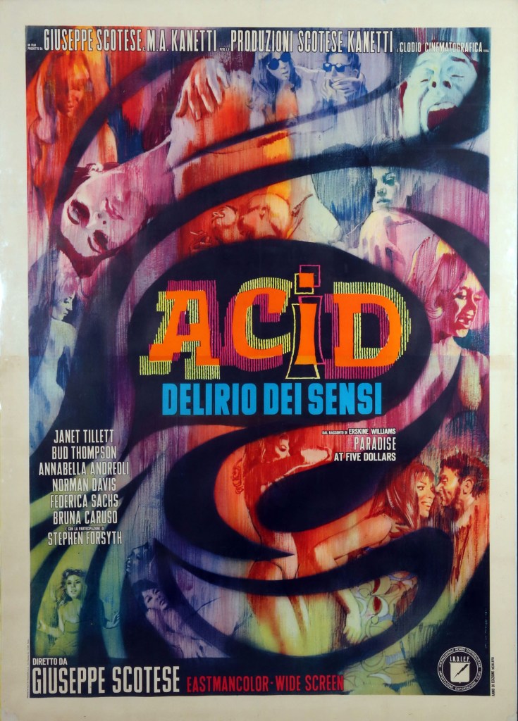 “Acid: Delirio dei Sensi” aka “Acid: Delirium of the Senses” is a 1968 Italian film directed by Giuseppe Maria Scotese. Set in New York City, it blends elements of drama and pseudo-documentary to explore the counterculture and drug scene of the late 1960s.