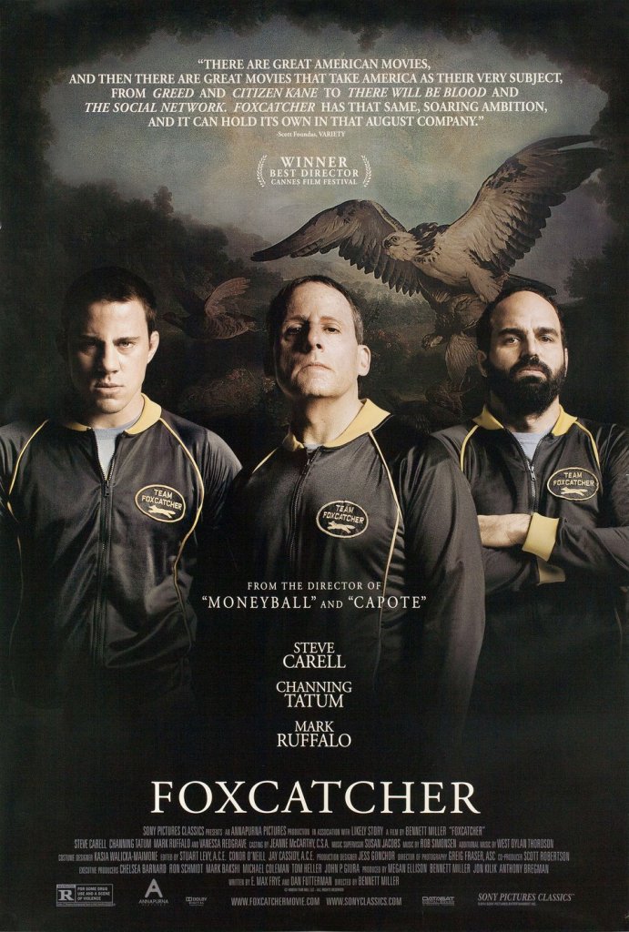 “Foxcatcher” is a 2014 psychological drama and true crime biopic directed by Bennett Miller and written by E. Max Frye and Dan Futterman, based on the harrowing real-life events involving Olympic wrestlers Mark and David Schultz, as well as eccentric millionaire John du Pont. The film explores themes of power, manipulation, loneliness, and the toxic underbelly of American exceptionalism. It earned critical acclaim for its restrained direction, haunting tone, and powerful performances, especially by Steve Carell, who underwent a dramatic transformation for his role.