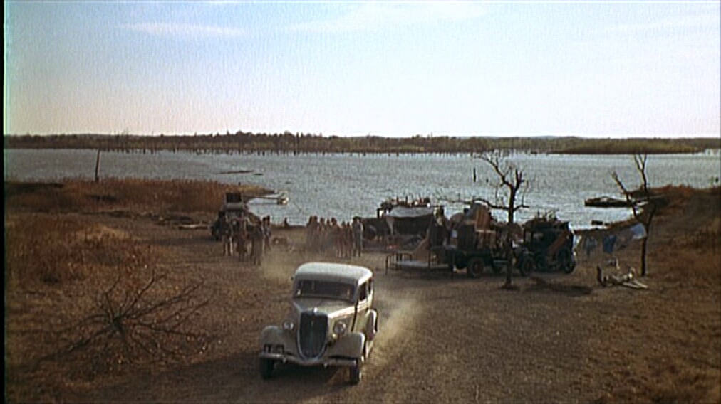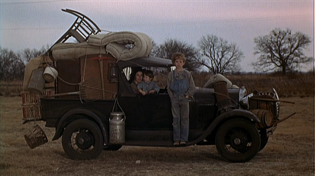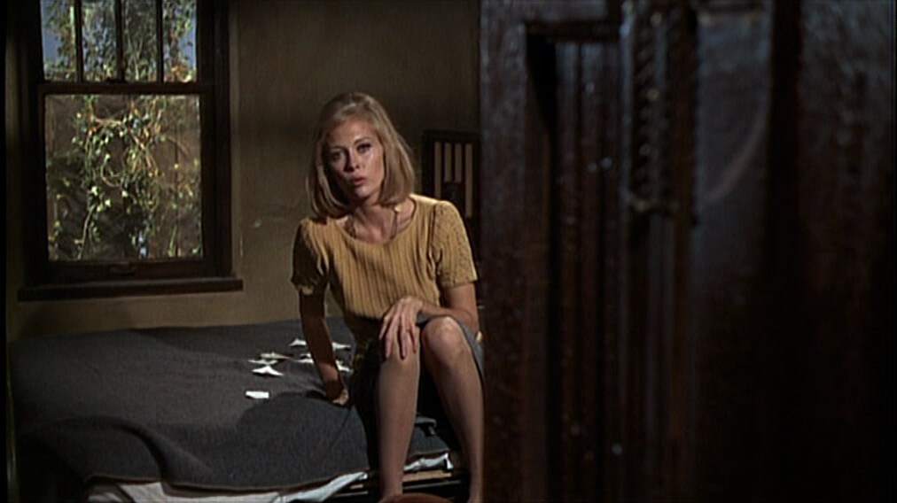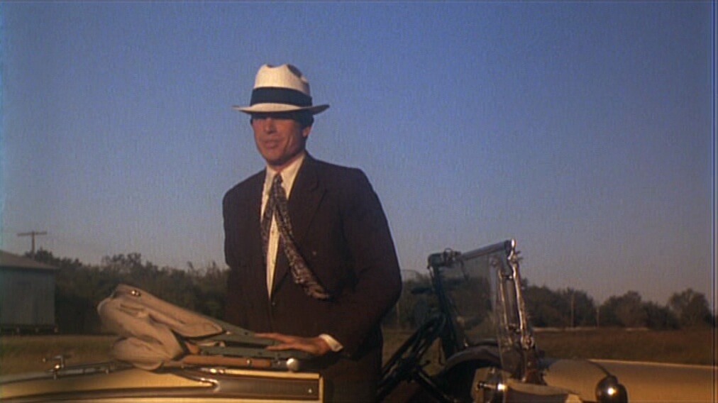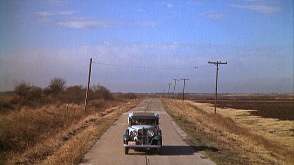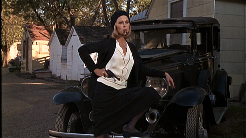 The film opens with a sepia-toned montage of old photographs and newspaper clippings that introduce the historical context—Depression-era America—and set a nostalgic yet somber tone. This leads to the first glimpse of Bonnie Parker in her bedroom, where she is bored and restless. She spies Clyde Barrow, attempting to steal her mother’s car.
