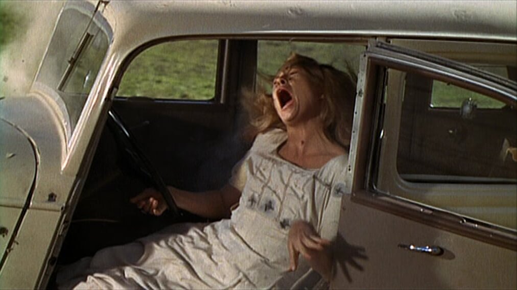 As their crimes escalate, they are joined by others: C.W. Moss (Michael J. Pollard), a dimwitted but loyal mechanic who becomes their getaway driver, and later Clyde’s older brother Buck Barrow (Gene Hackman) and Buck’s deeply religious wife Blanche (Estelle Parsons). The Barrow Gang, as they become known, gains notoriety, and the group is both glamorized and vilified in the media.